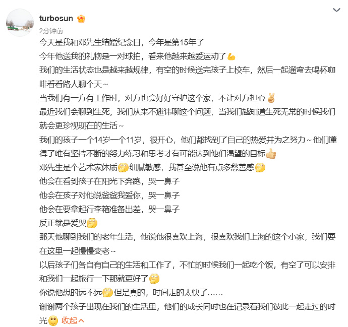 6月7日,孙俪发长文称今天是自己和邓超第15周年结婚纪念日。